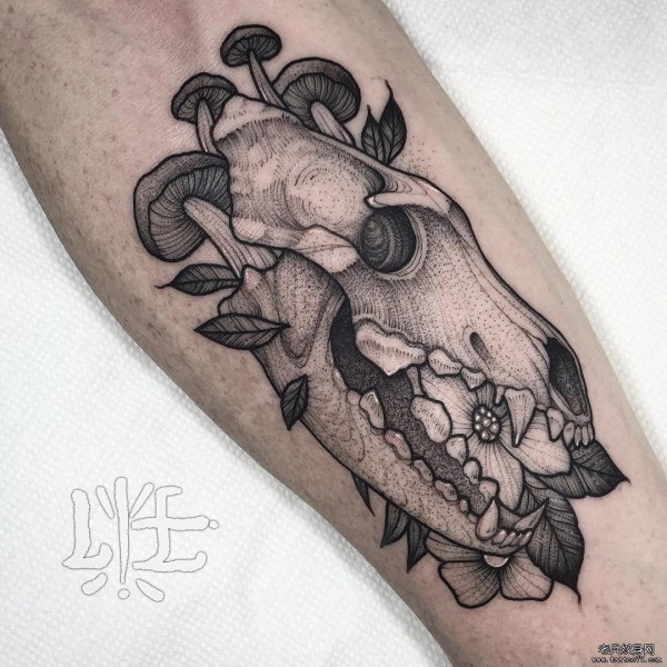 小臂点刺欧美恐龙头骨蘑菇纹身图案