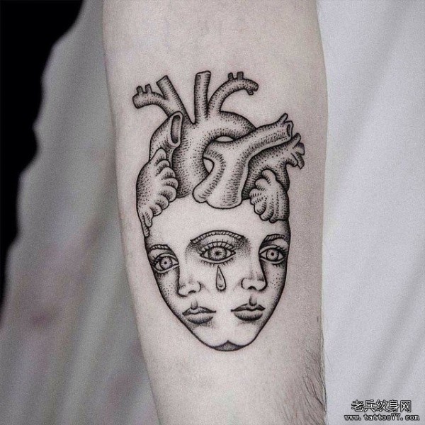 小臂心脏人像组合点刺纹身图案