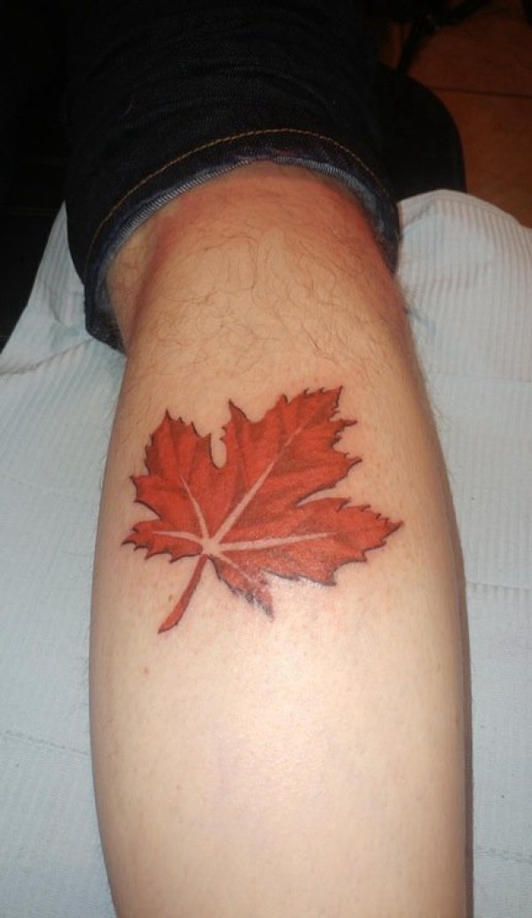 小腿上小清新植物纹身红色枫叶纹身图片