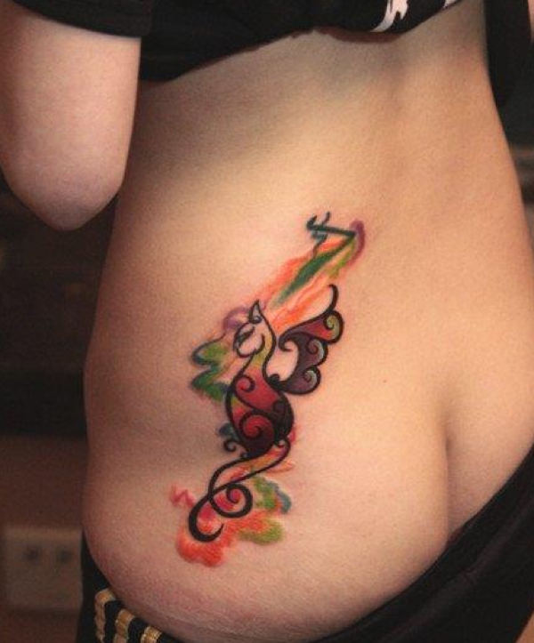 腰部好看的彩色图腾猫咪纹身图案