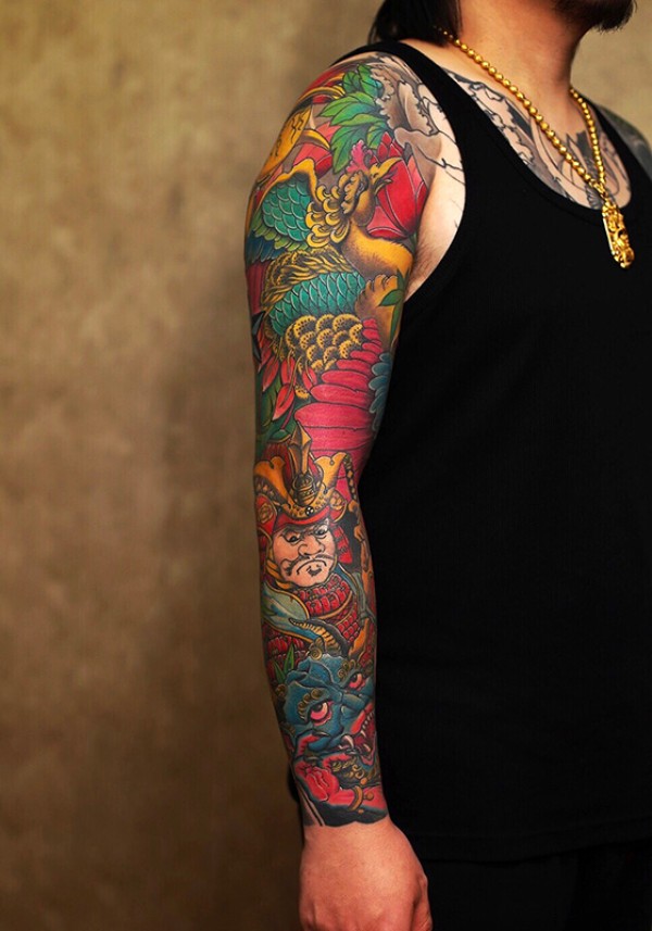 好看的凤凰与武士花臂纹身图案