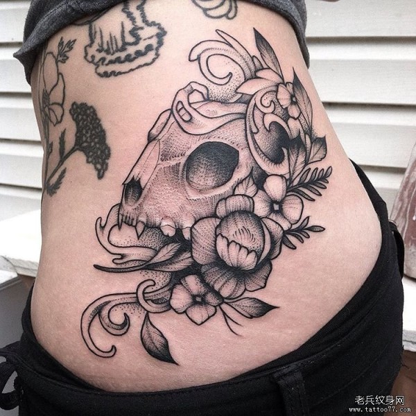 背部欧美骷髅花卉线条点刺纹身图案