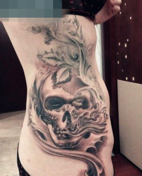 美女侧腰超酷的黑白骷髅纹身图案