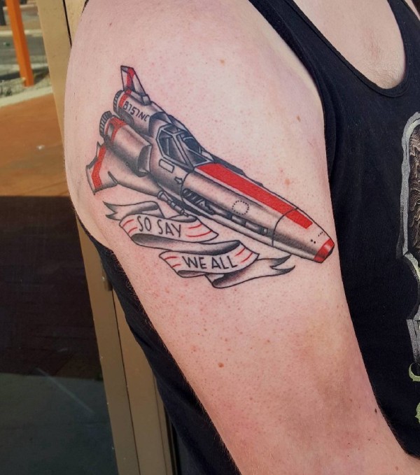 男子右手大臂上漂亮的太空堡垒飞船纹身图片