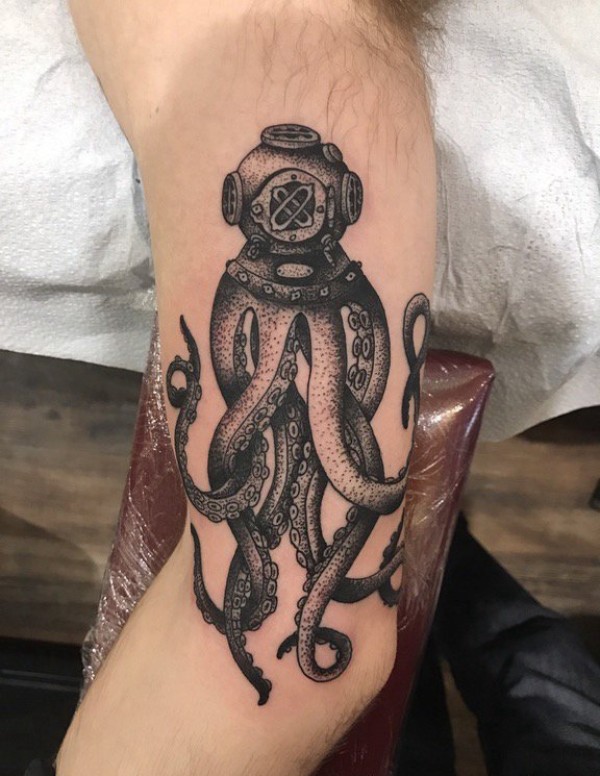 手臂上黑色章鱼纹身点刺纹身机械图片