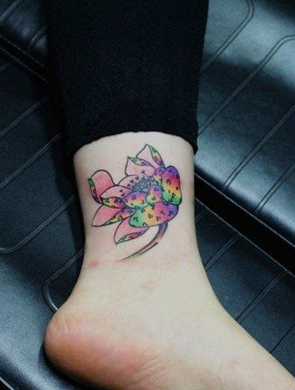 女孩子脚踝精美的七彩莲花纹身图案