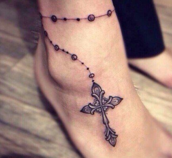 女性脚踝十字架脚链纹身图案