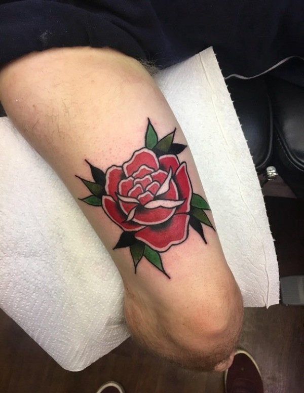 大腿部漂亮的传统风格玫瑰花纹身图片