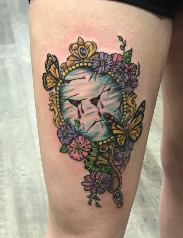 大腿上漂亮的蝴蝶花朵和花镜纹身图片