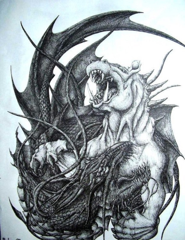 黑白龙的战斗图案纹身手稿素材