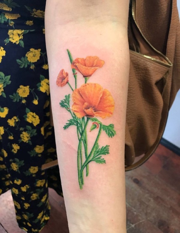 美女手臂上小清新植物纹身加州罂粟花纹身图片