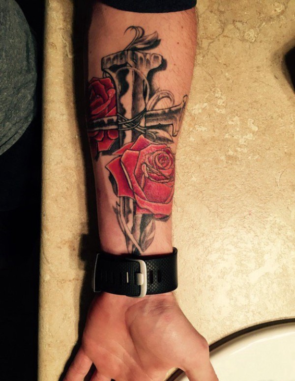 男性手臂内侧彩色十字架纹身玫瑰花纹身图片