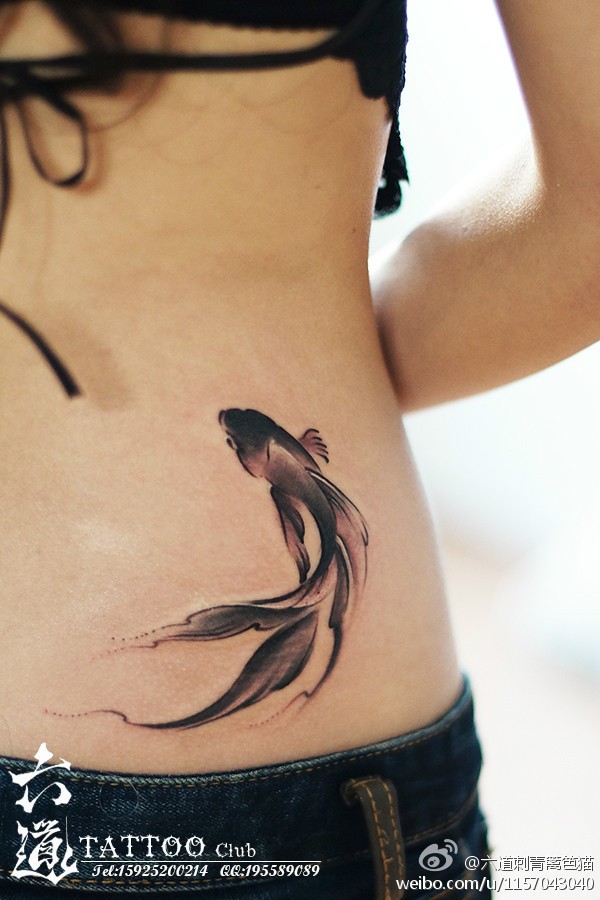 女生后腰纹身黑白灰风格抽象线条纹身图案