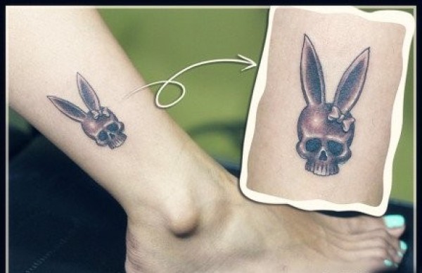 女孩子腿部一张兔耳朵的骷髅纹身图案