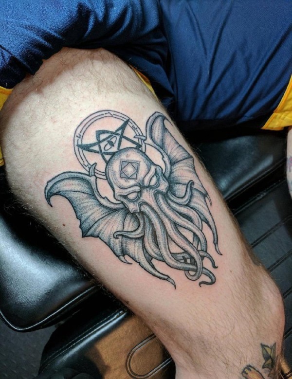 大腿上的个性的蝙蝠章鱼合体的恶魔纹身图片