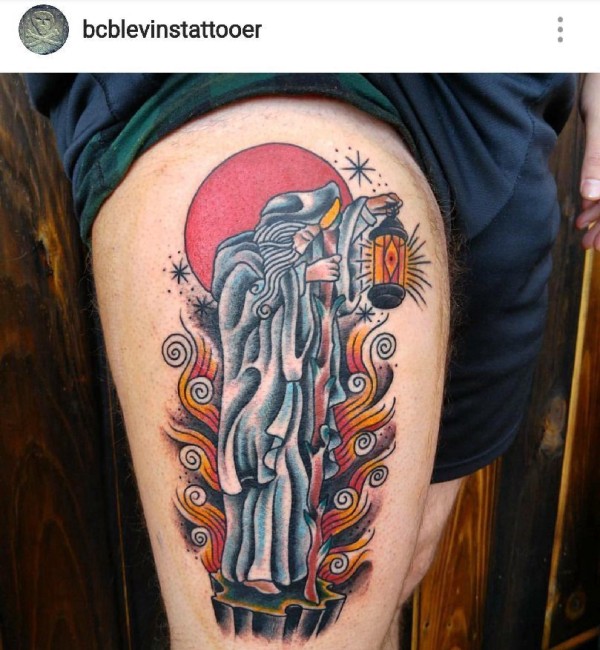 大腿上的卡通风格形象神秘的德鲁伊纹身图片