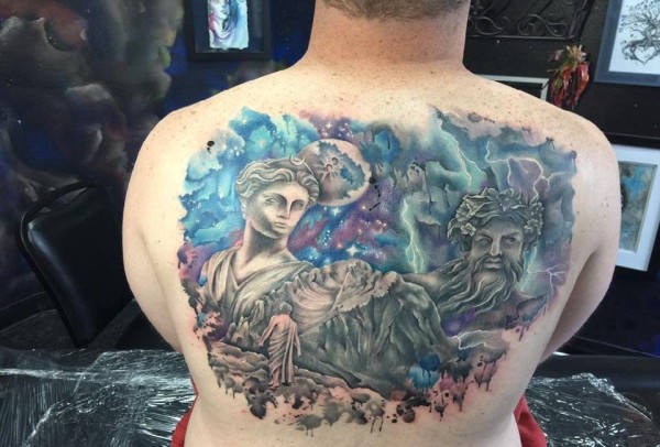 男性后背上的希腊诸神纹身图片