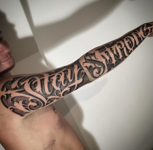 中国有嘻哈TT手臂上花体英文纹身图片