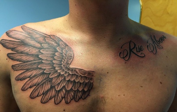 男性锁骨上的英文字和右胸部上的一只天使翅膀纹身图片