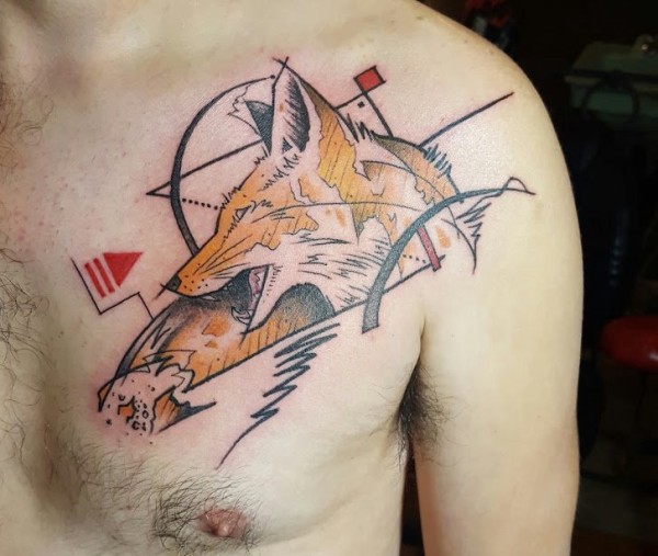 男子左胸部上的几何图形和狐狸纹身图片