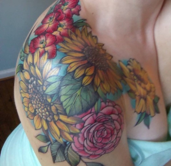 女性右肩臂上漂亮的彩绘纹身小花朵图片