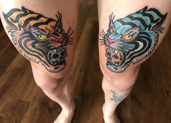 双大腿上的老虎和嘴里的骷髅头纹身图片