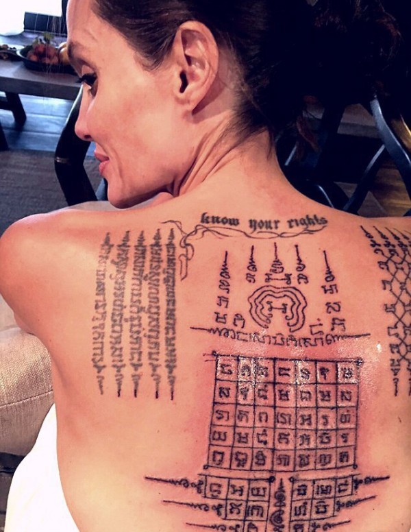 影视女明星安吉丽娜·朱莉背上的印度风格纹身图片