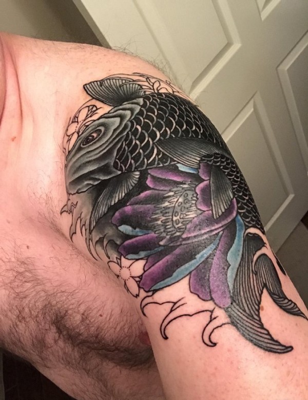 男子肩膀上的大黑色鲤鱼和蓝紫色莲花纹身