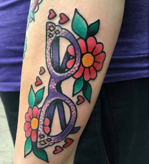 手臂上传统彩色纹身小花朵纹身盒眼镜纹身图片
