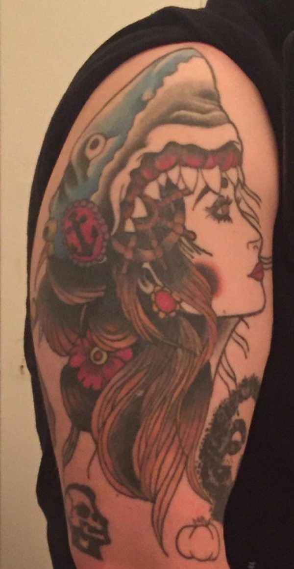 右手大臂膀上的漂亮鲨鱼头饰女子纹身