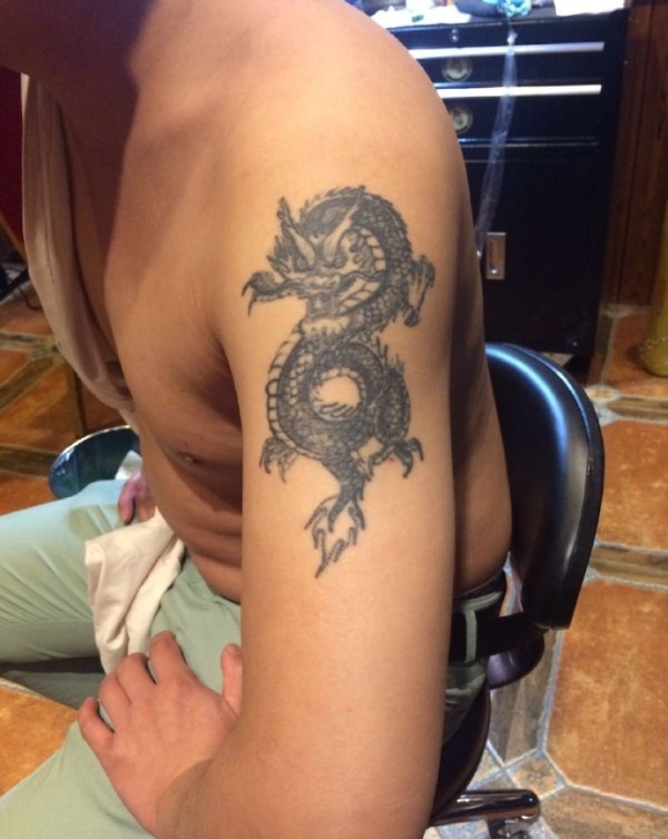 男子左肩膀上帅气的过肩龙纹身图案