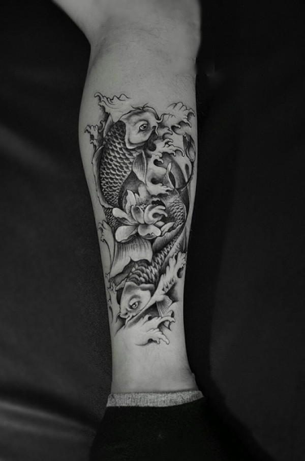 传统鲤鱼花小腿纹身_腿部纹身图案大全_纹身图吧