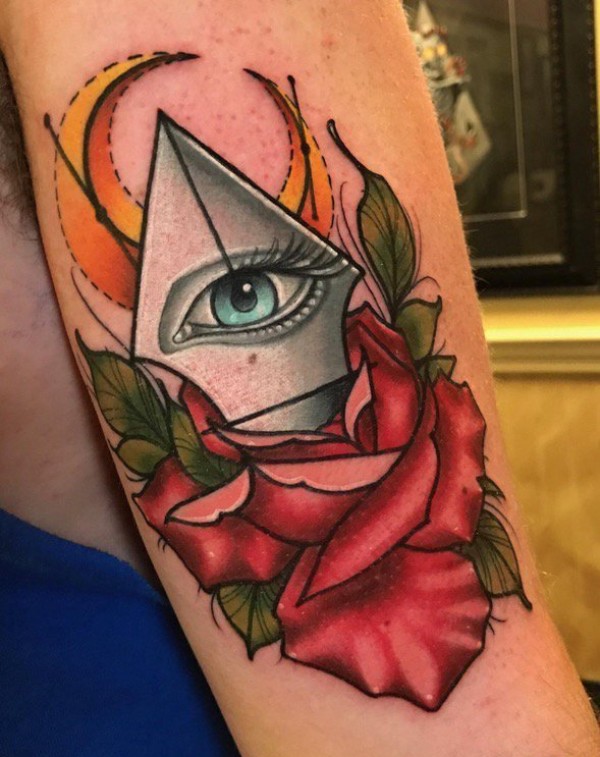 手臂上的弯月钢笔尖花朵纹身图片