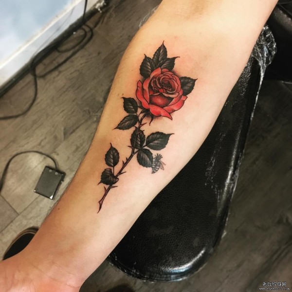 小臂欧美红玫瑰彩色纹身图案