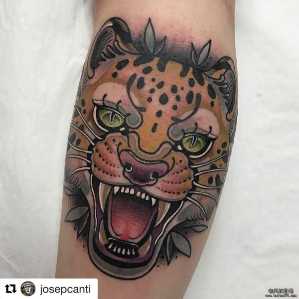 小腿欧美school绿眼老虎纹身图案