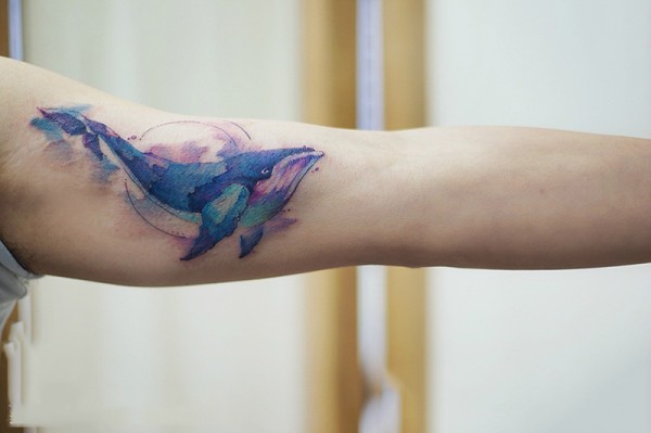 手臂遨游的鲸鱼水彩纹身图片