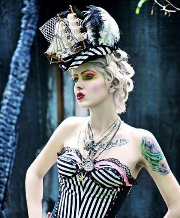欧美潮女个性胸部英文与手臂彩色纹身图案
