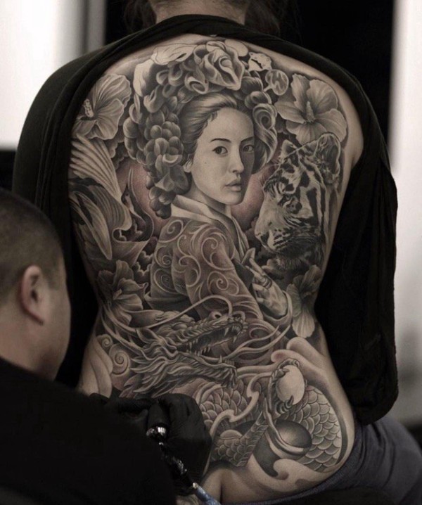 男人日本风格纹身龙头和艺伎纹身图片