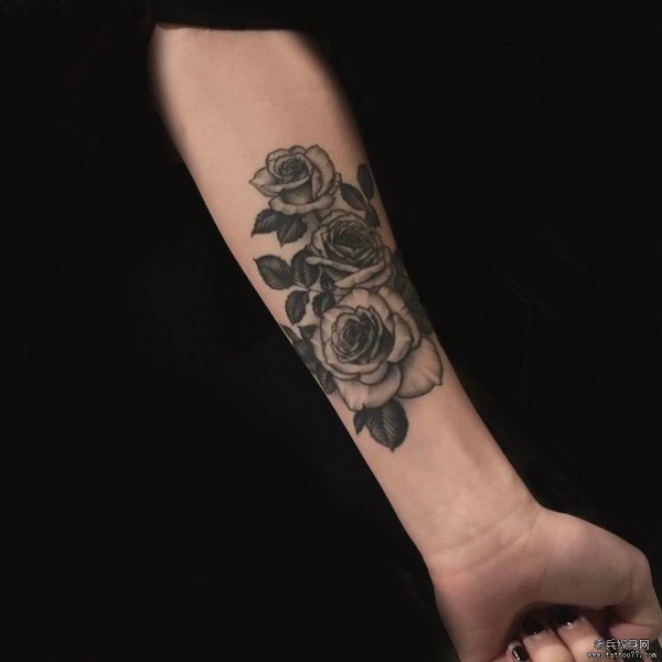 小臂欧美玫瑰黑灰纹身图案