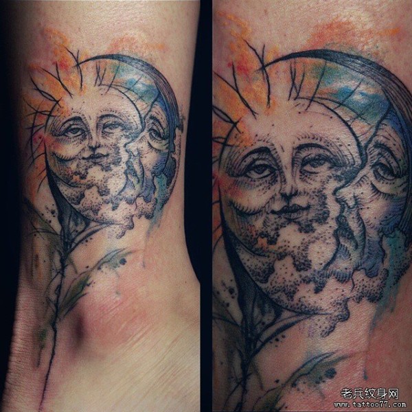 脚踝欧美太阳月亮水彩点刺纹身图案