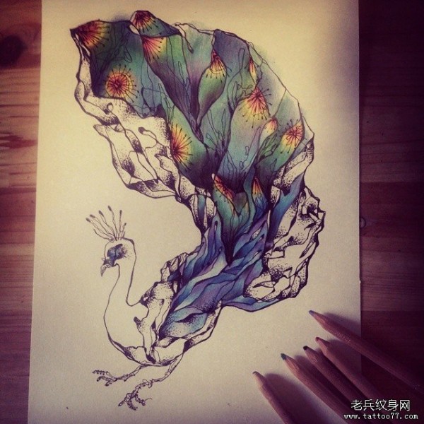 欧美孔雀泼墨水彩小清新纹身图案手稿