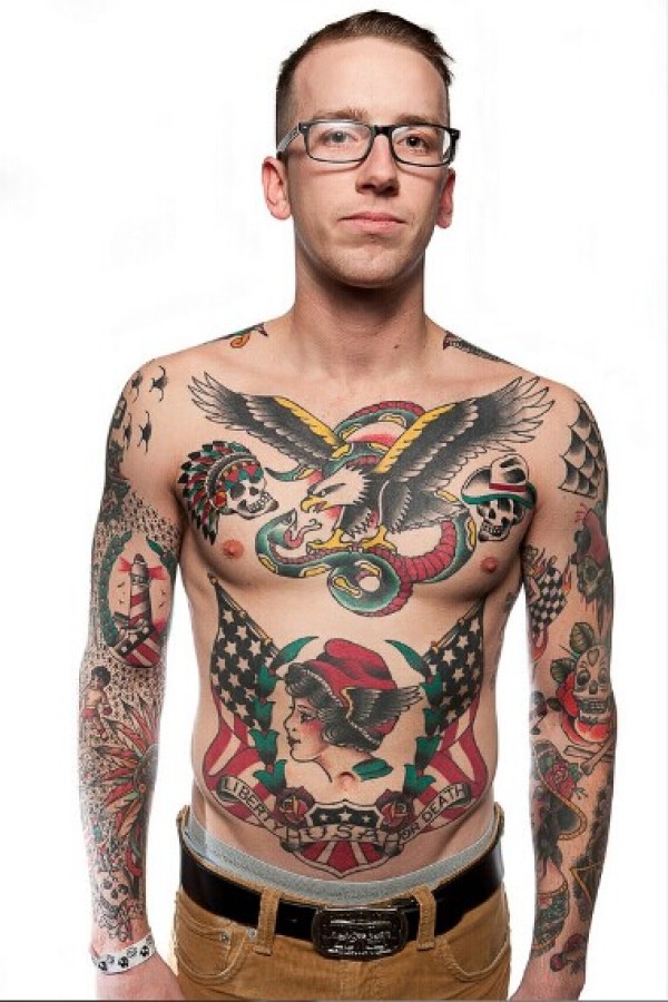 欧美男个性old school老鹰蛇骷髅纹身图案