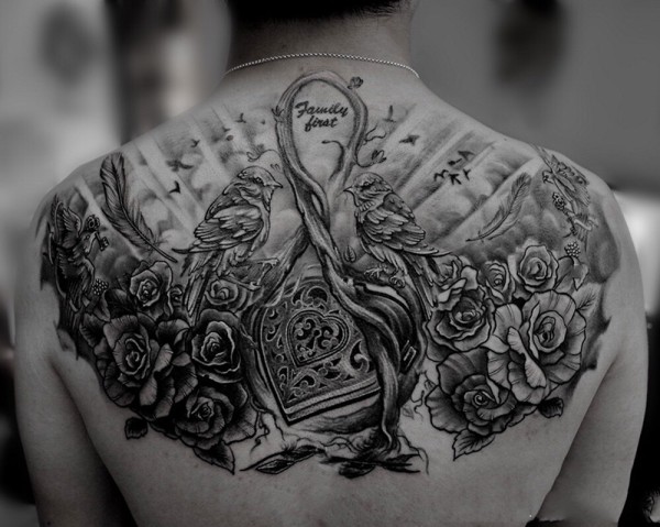 背部玫瑰小鸟双宿双栖个性纹身图片