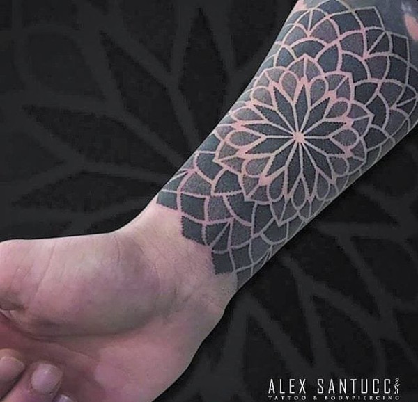 手臂上彩色几何点刺纹身曼陀罗图案纹身