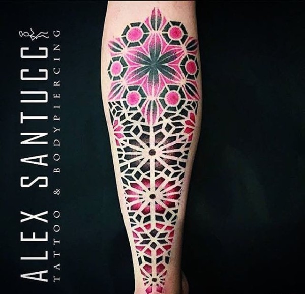 手臂上彩色几何点刺纹身曼陀罗图案纹身