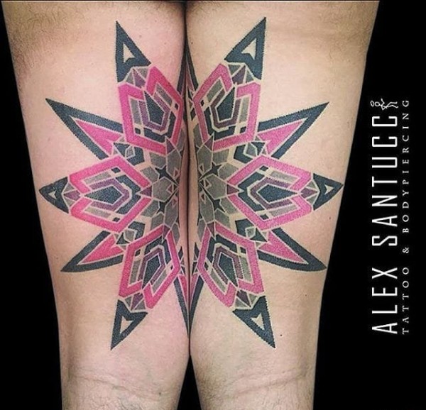 手臂上彩色几何点刺纹身曼陀罗图案纹身