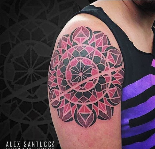 手臂上彩色几何点刺纹身曼陀罗图案纹身