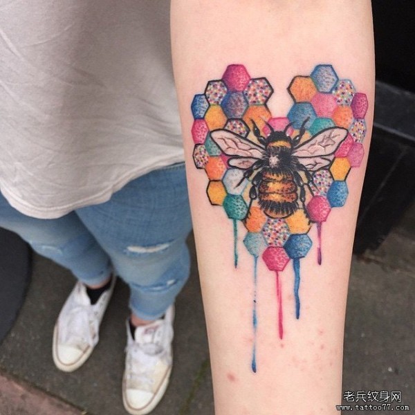 小臂欧美school蜜蜂泼墨点刺蜂巢纹身图案