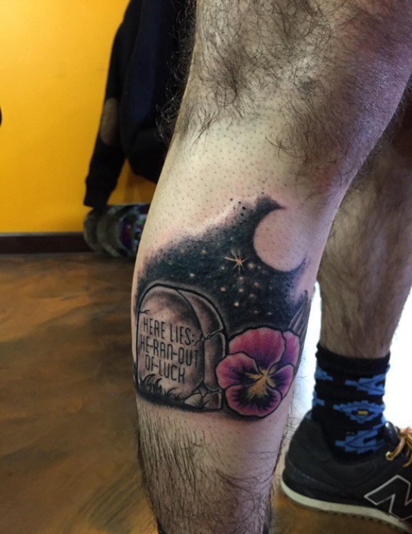 小腿上的花朵和致敬棒球的墓碑图案纹身