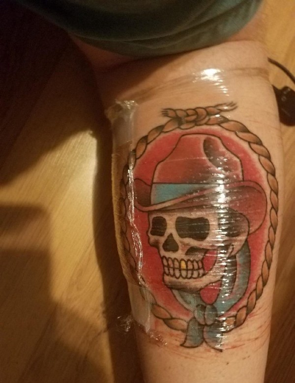 小腿上的绳子和牛仔帽和骷髅头纹身